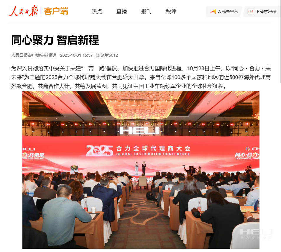 11月2日,以“星耀新程 聚力共贏”為主題的2025年度合力國內(nèi)營銷大會(huì)在合肥啟幕,引發(fā)媒體廣泛關(guān)注,中國新聞社、經(jīng)濟(jì)日報(bào)、證券日報(bào)、香港商報(bào)、中安在線、合肥新聞聯(lián)播等中央、省市、香港媒體現(xiàn)場參會(huì)報(bào)道,報(bào)道聚焦戰(zhàn)略規(guī)劃、產(chǎn)品發(fā)布及國內(nèi)營銷布局,通過圖...